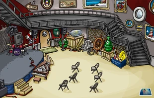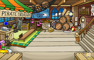 By the stage, there are folding chairs, and a piano, while on the stage there is a microphone and a drum set. Along the walls, there are fishing nets, buoys, crates, barrels, and more, as well as various novelties, such as a ship in a bottle, ship's wheel, and more. Hung on the wall are various paintings, as well as one portrait of Captain Rockhopper. There is a spiral staircase leading up to the Beacon at the edges of the walls. A box containing musical instruments is also here, which are sold through the Music Catalog.