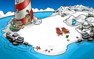 1) Beach: The Beach is a coastal area in the southwest corner of the island. As it is bordered by the sea, it is a popular place to relax. Located here is the Lighthouse, which not only served as a hangout, but helped guide ships, including the Migrator, owned by Captain Rockhopper, who frequently docks here.