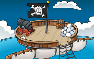 It is remove sparse, and contains simply the Snow Cannon, some ammunition, and a large jolly roger flag in the center. There is railing surrounding the entirety of the Crow's Nest, and there is a series of shrouds which serve as a ladder of sorts lying between the nest and deck.