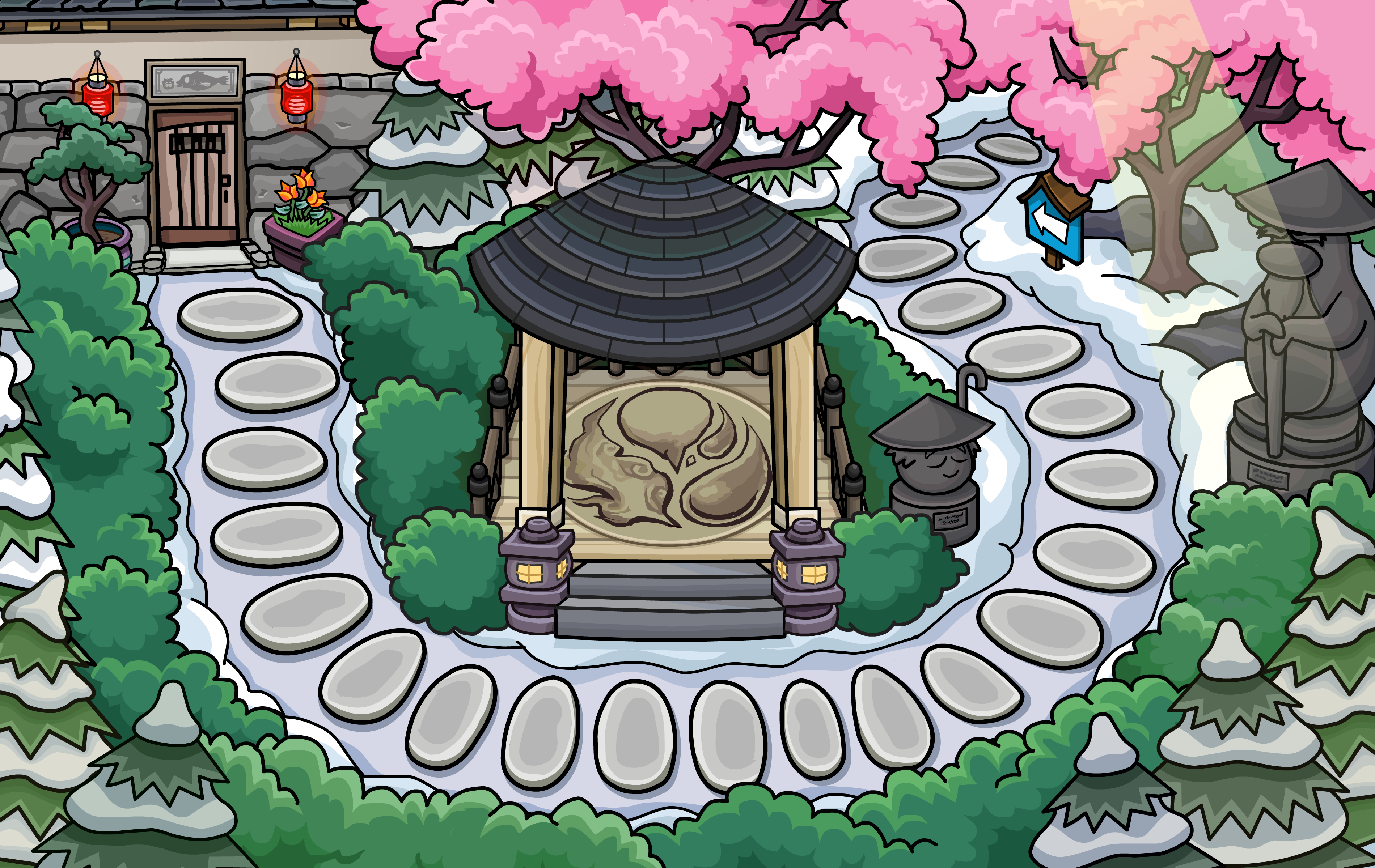 47) Dojo Pathway: The Dojo Pathway is a secret room within the Dojo. In its initial appearance, it appears as a walkway to the Serene Springs. Present in the room there is a statue of Sensei, his puffle, Sage, and two Cherry Blossom trees. There also appears to be a sort of gazebo near the center of the room. The only way to gain access to this room is through the Hidden Dojo Room which requires the Wise Puffle Pin to be granted entrance to.