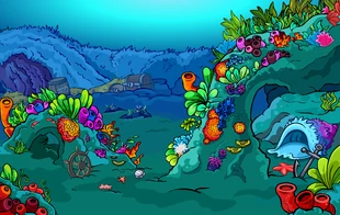 38) Underwater: Underwater is an aquatic place located on the seafloor of Club Penguin Rewritten. It can be accessed from a door in the Hidden Lake. However, the door is locked, and requires players to enter it via a different route, by playing Puffle Rescue. On the door there's a note on how to get in. Once inside, players can get the Moss Key Pin, and keep the door open. After obtaining the pin, it disappears from the room.