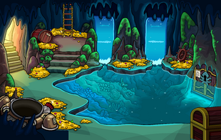 15) Hidden Lake: The Hidden Lake is a subterranean lake in Club Penguin Rewritten. It opens to the sea, and a variety of sunken treasure drifts here from underwater. Waterfalls flow here into the sea from underground reservoirs.