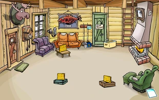 There is a wooden green door with a sign labelled "gone fishing" in which players can engage in the mini-game Ice Fishing. Across the room, and in the Lodge Attic are tables with the mini-game Find Four on top of them.