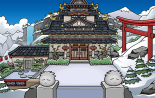 11) Dojo Courtyard: The Dojo Courtyard is an area in Club Penguin Rewritten. The entrance to the Dojo lies here, where penguins hope to become skilled ninjas, and enter the Ninja Hideout.