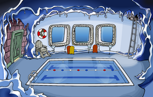 32) Underground Pool: The Underground Pool (or more formally known as the Cave) is an underground room that houses a swimming pool, windows, some swimming boards, and a Lifeguard chair. It does receive occasional attention from Club Penguin Rewritten via decorating the Cave during parties.