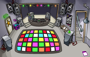 20) Night Club: The Night Club is a building in the middle of the Town. Beneath the Night Club (with the entrance hidden in a speaker) is the Boiler Room. In the Night Club you can play DJ3K and Dance Contest. Stamps can be earned here if a lot of penguins dance on the dance floor. Behind the view of the camera is a window to the outside, several posters, a green puffle bed, and a sign saying the Dance Lounge is upstairs (these are only seen in missions)