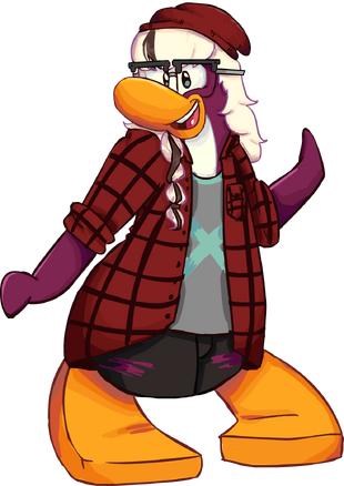 Descripción física: Delphine es una pinguina de color morado, con un sombrero del color de su ropa. Su cabello es de un color amarillo dorado, y lleva una manga arrancada de su camiseta amarrada al brazo. También lleva una camiseta café claro, con una chaqueta café oscuro con bordes blanco. Ella usa un cinturón dorado con un puffle en el, y una falda jeans un poco desgarrada.