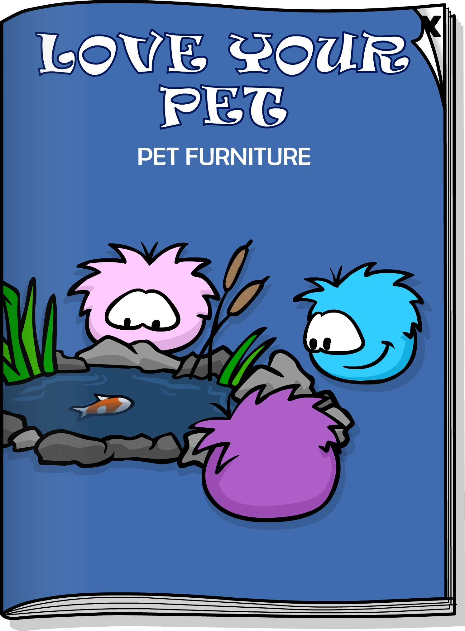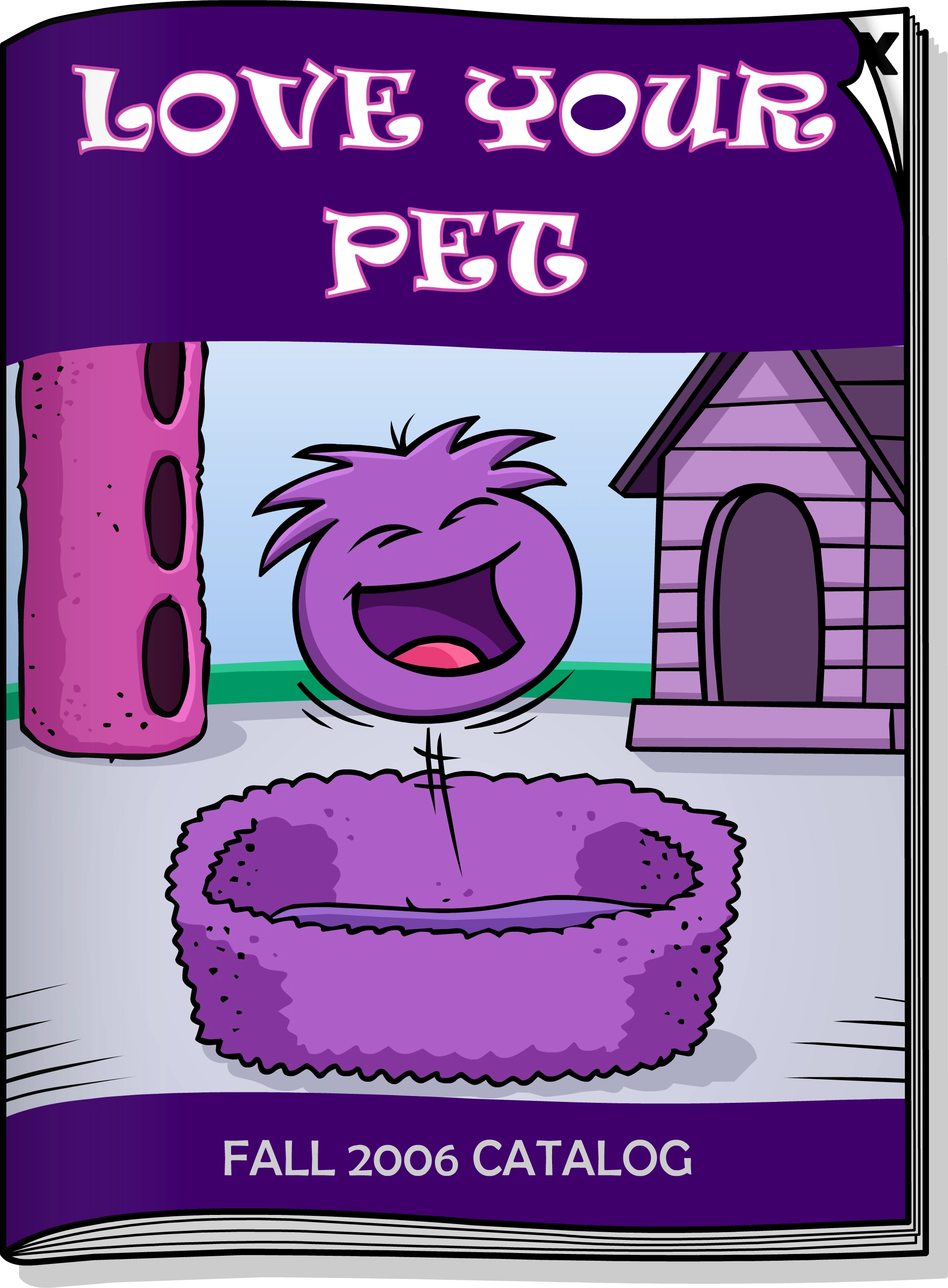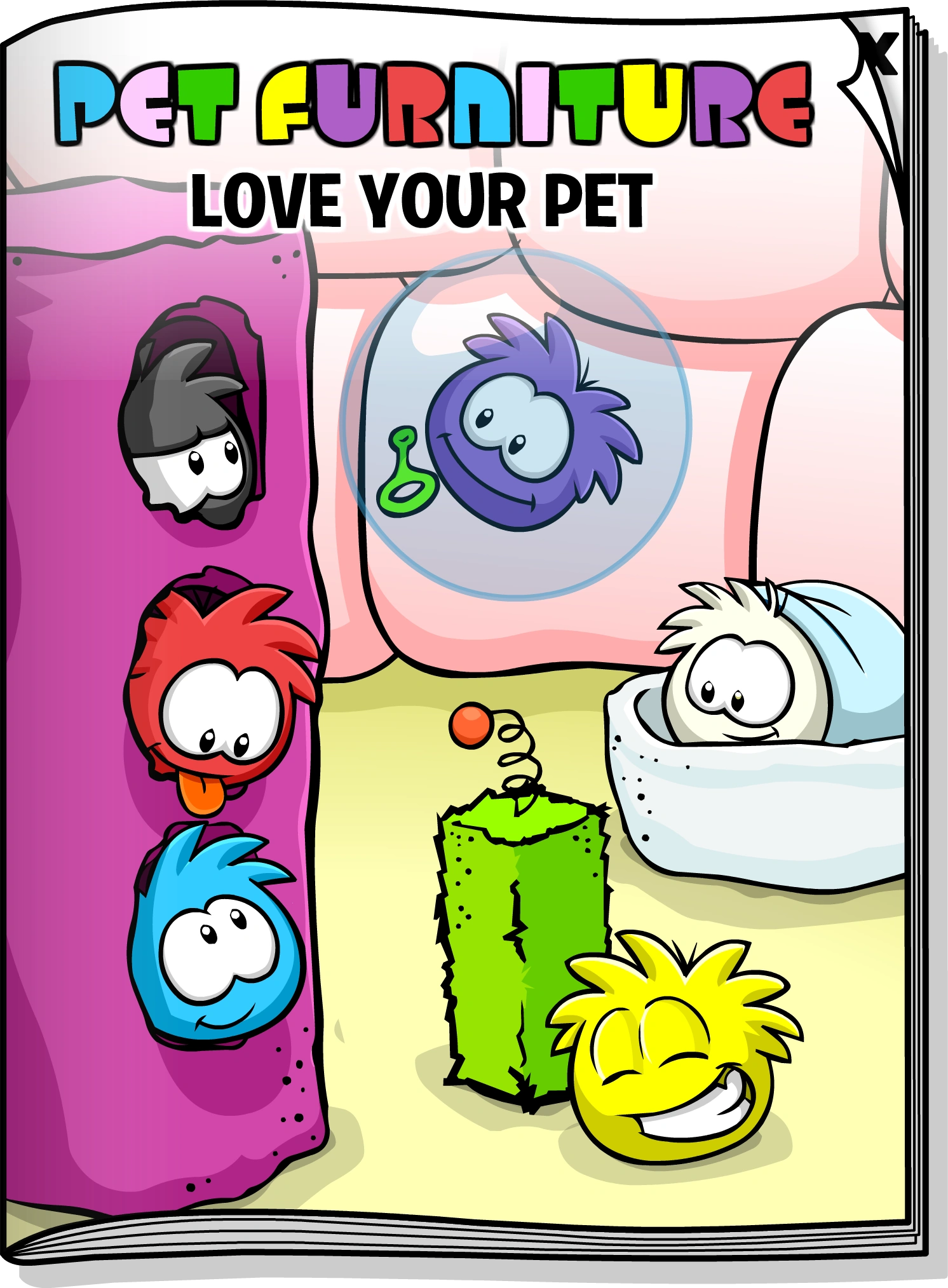 Puffle Catalog (formerly Pet Furniture: Love Your Pet and Love Your Pet) was a catalog in the Pet Shop and your igloo which sold various puffle-related items. A new catalog came out approximately every year. In every issue of the catalog, there were puffle beds, feeding dishes, food and furniture that puffles could interact with. Most items in the catalog could only be purchased by members, but the puffle food items could be purchased by non-members as well.