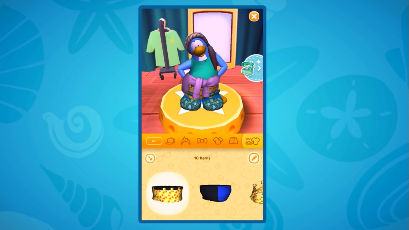 A key feature in Club Penguin Island is the ability to create custom clothing items using a feature called Clothing Customizer, by using a blueprint as a base and fabrics and/or decals as optional design elements.