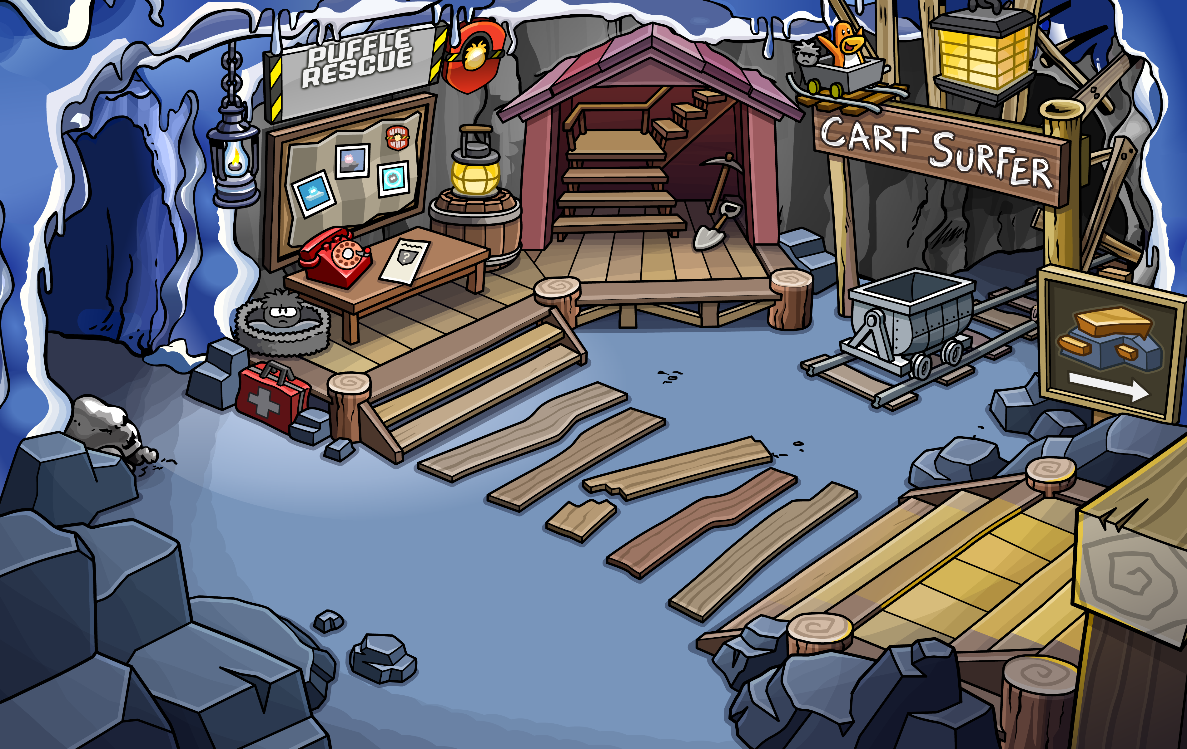 The Mine was an underground chamber in Club Penguin. Mine tracks led into deeper and dangerous caverns, where Cart Surfer could be played. After puffles started getting lost here, Puffle Rescue could be played to save them.