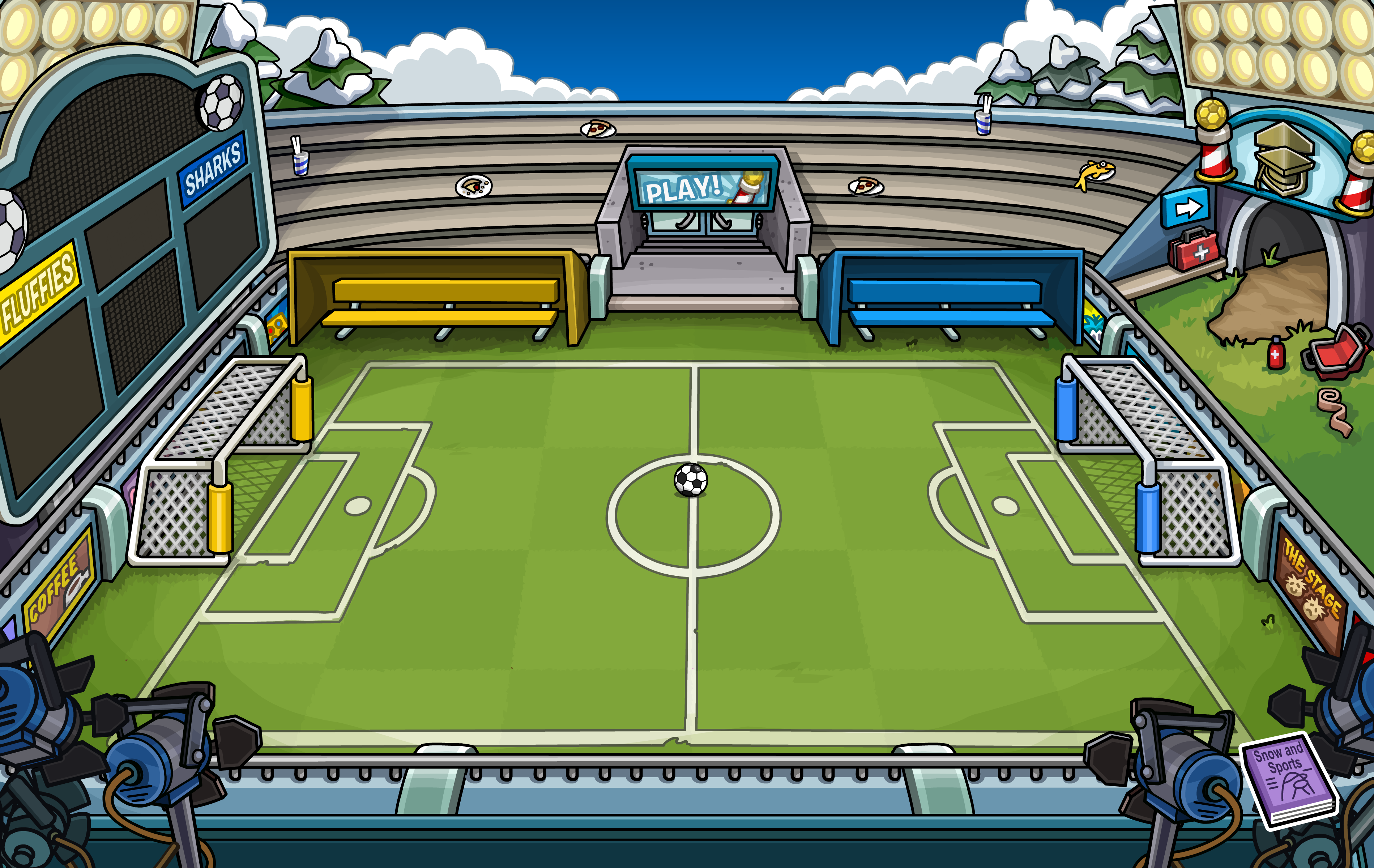 The Stadium (formerly known as the Soccer Pitch) was a sports field covered in artificial turf, and was the counterpart to the Ice Rink. Located near the Snow Forts, penguins were able to play soccer there, by running around, and kicking the soccer ball into nets. The Stadium was open only in the summer and autumn months of the Northern Hemisphere. The Snow and Sports catalog is also located here.