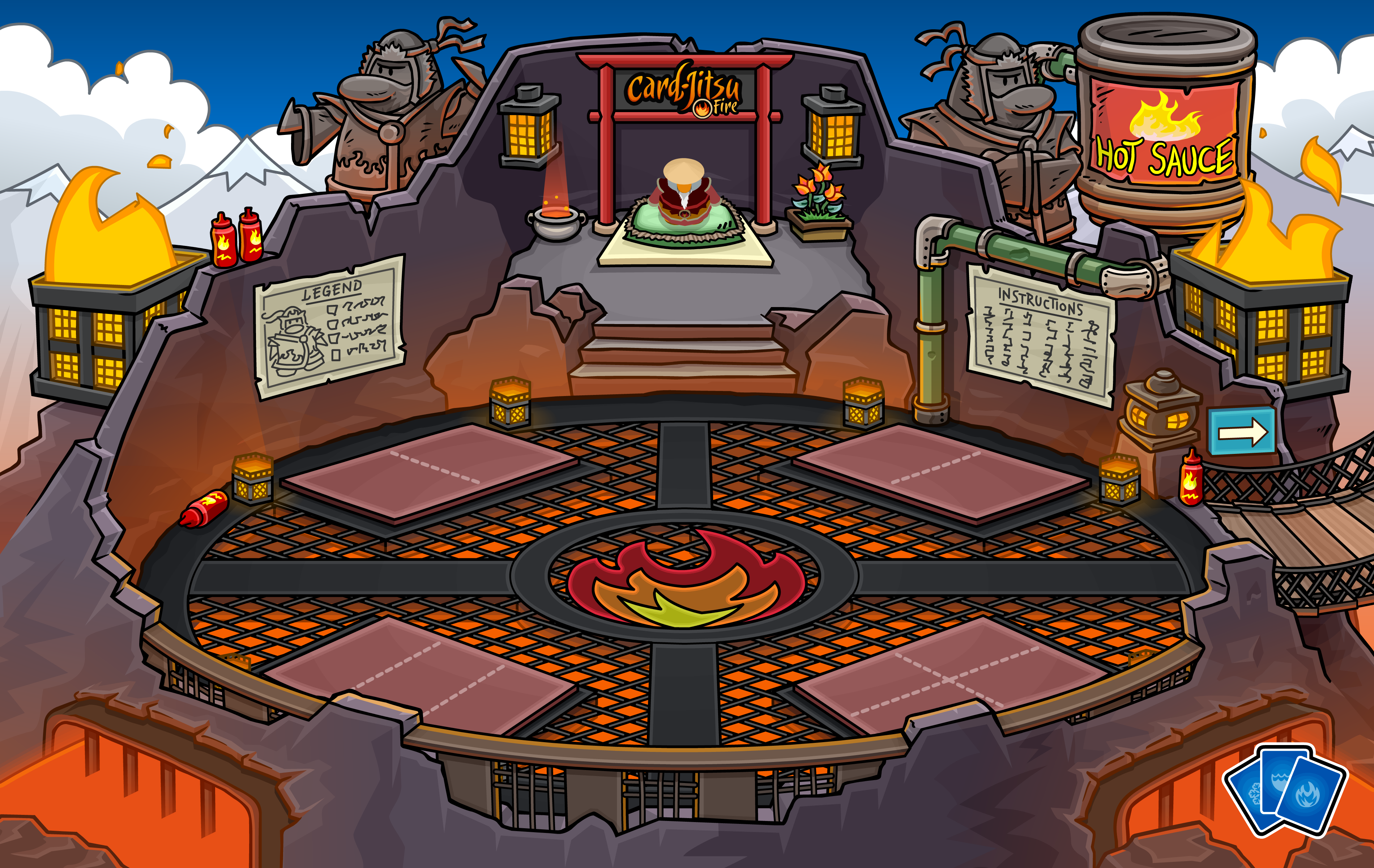The dojo itself was positioned on a large steel grate, over the mouth of the Volcano, with lava directly below. Streams of lava flowed down, over the edge of the Volcano. There were two statues of Fire Ninjas, a large tub of hot sauce, and a raised platform where Sensei resided. There were also a few Card-Jitsu Mats, hot sauce bottles, and a few lanterns. There was a bridge which led back to the Dojo.