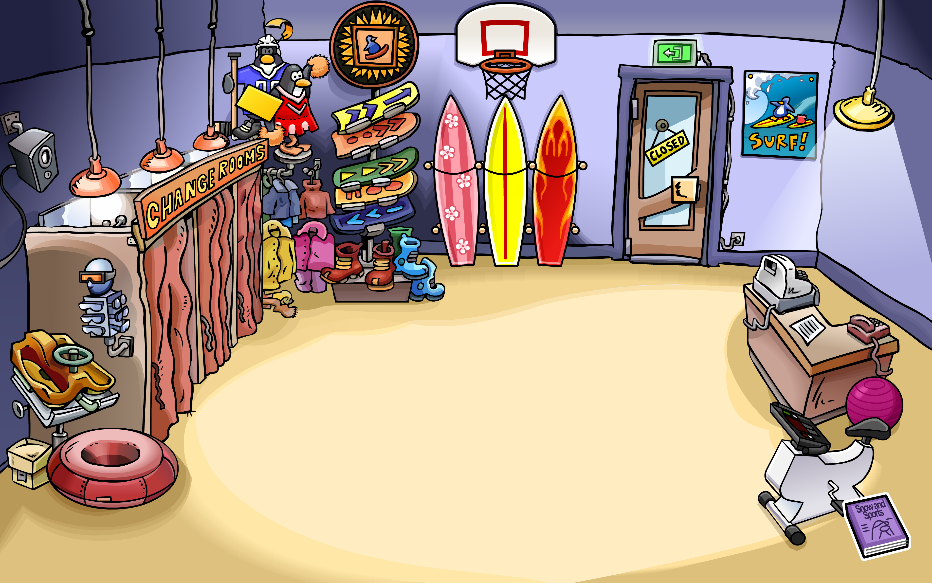 The shop was filled with various sport equipment, with many racks and stands displaying things. There were changing rooms on the side of the room (one of which was a secret entrance to the PSA HQ) and a counter. Only viewable in Secret Missions, the back wall also had a table covered with machine parts, and hanging over it were blueprints, which all belonged to Gary the Gadget Guy. Next to the table, behind a door, was a staircase leading to Gary's Room.