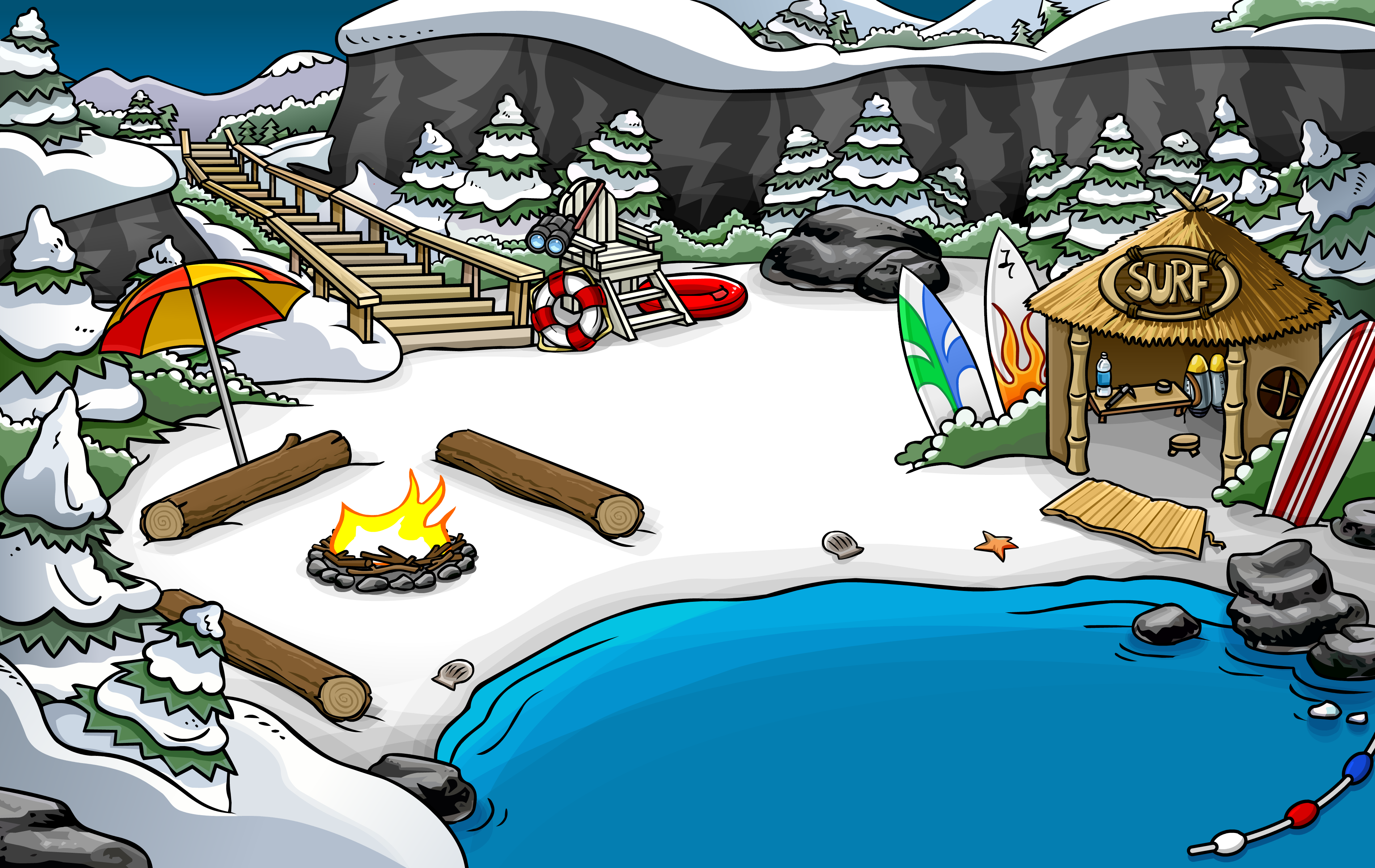 The Cove was a secluded bay in Club Penguin located on the southeast shore of the Club Penguin Island, near the Forest. Due to being in close proximity to the ocean, it was a popular spot for surfing and swimming. The surf shack was a spot for penguins to lounge and get ready to play Catchin' Waves. Like the Beacon which had a Telescope, the Cove had Binoculars which you could use in order to look at the sea.