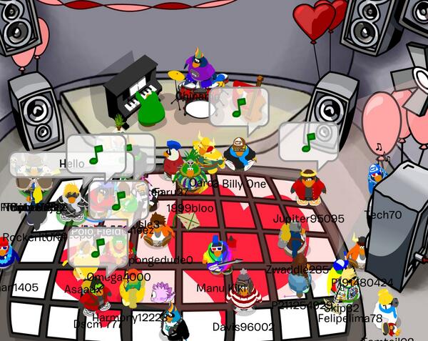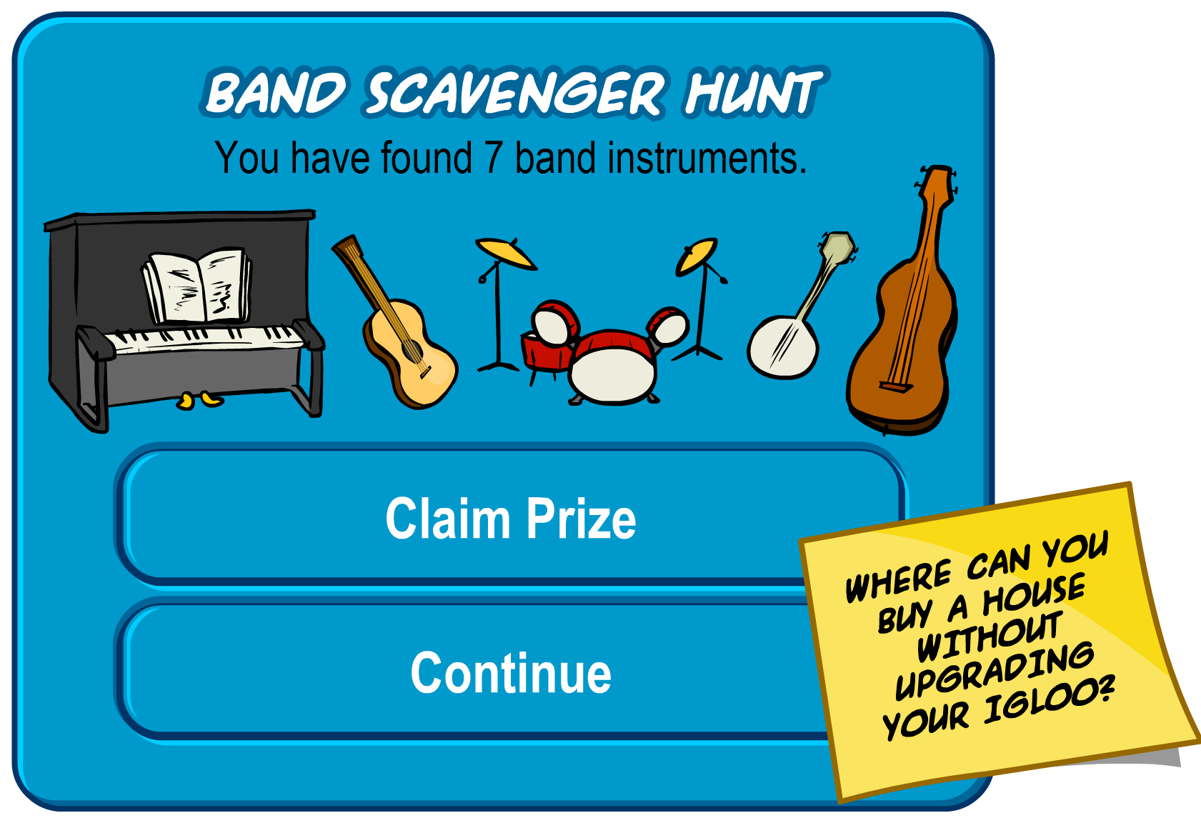 The first search for instruments arrived on the island. We looked for 5 instruments to help the Penguin Band which had lost them. As a reward they gave us an autographed fund for them! It was the first fund that had a famous character in the history of Club Penguin. The search with friends was fun!.