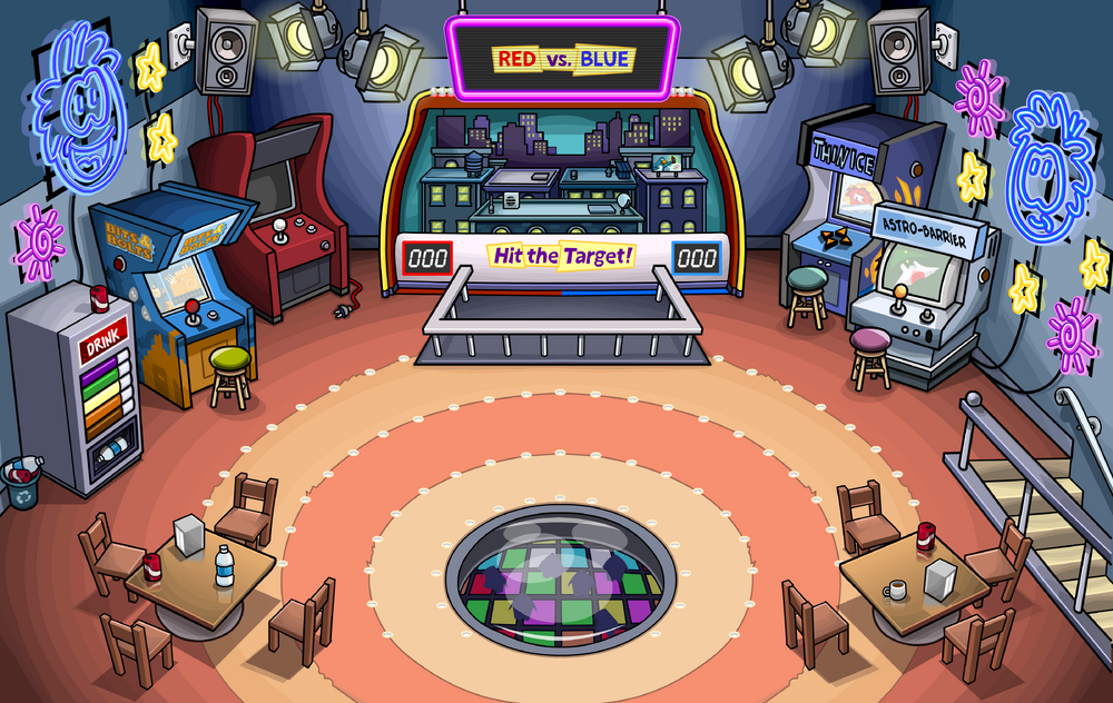 The Arcade (formerly known as the Dance Lounge) was the second floor of the Night Club, where penguins could play a variety of arcade games, or just sit around. There were four arcade machines in the room, on which penguins could play Astro Barrier, Thin Ice, and Bits & Bolts on. The fourth machine was a machine with no game. There were multiple tables, each with a few chairs, and a vending machine, as well as a target game. There was a window on the floor which showed part of the dance floor in the Night Club below.